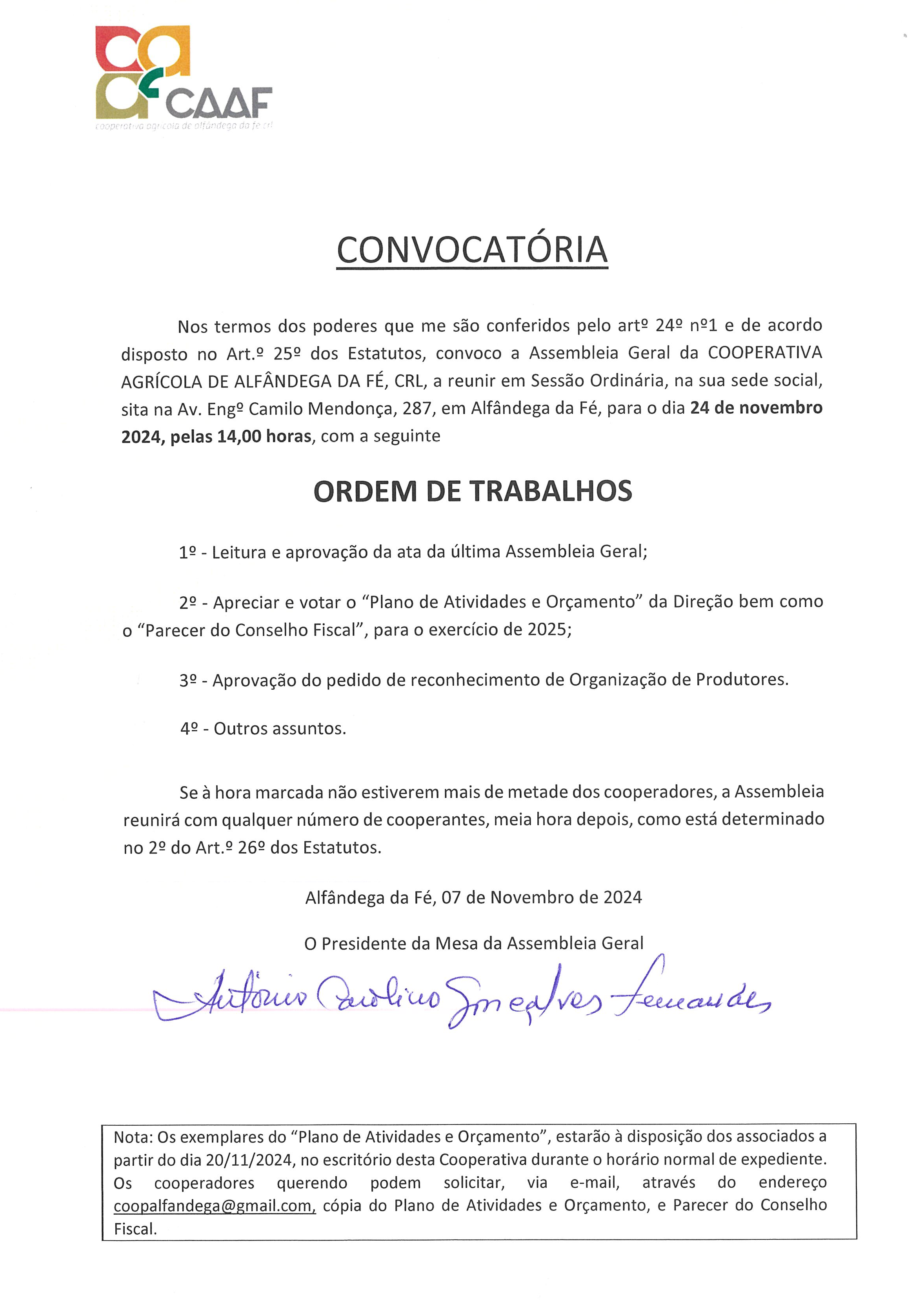 ACooperativa Agrícola de Alfândega da Fé, C.R.L. vem informar os associados(as), da Assembleia Geral a realizar-se no dia 24 de novembro de 2024, pelas 14h00, na sua sede social, sita na Avenida Engº Camilo Lemos de Mendonça.