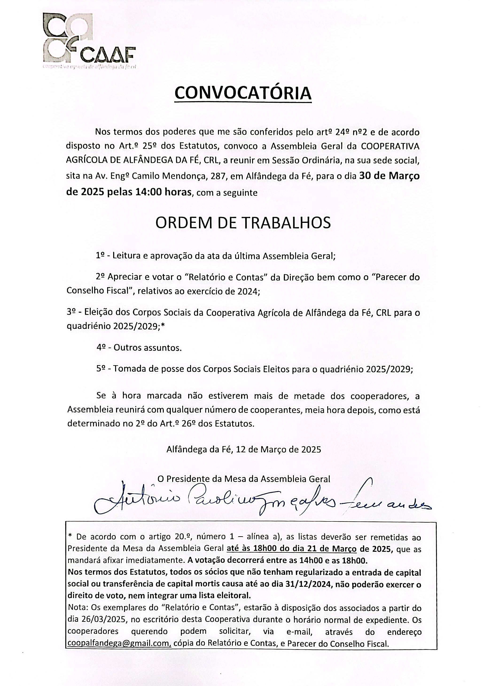 A Cooperativa Agrícola de Alfândega da Fé, C.R.L. vem informar os associados(as), da Assembleia Geral Ordinária a realizar-se no dia 30 de MARÇO de 2025 pelas 14h00, na sua sede social.